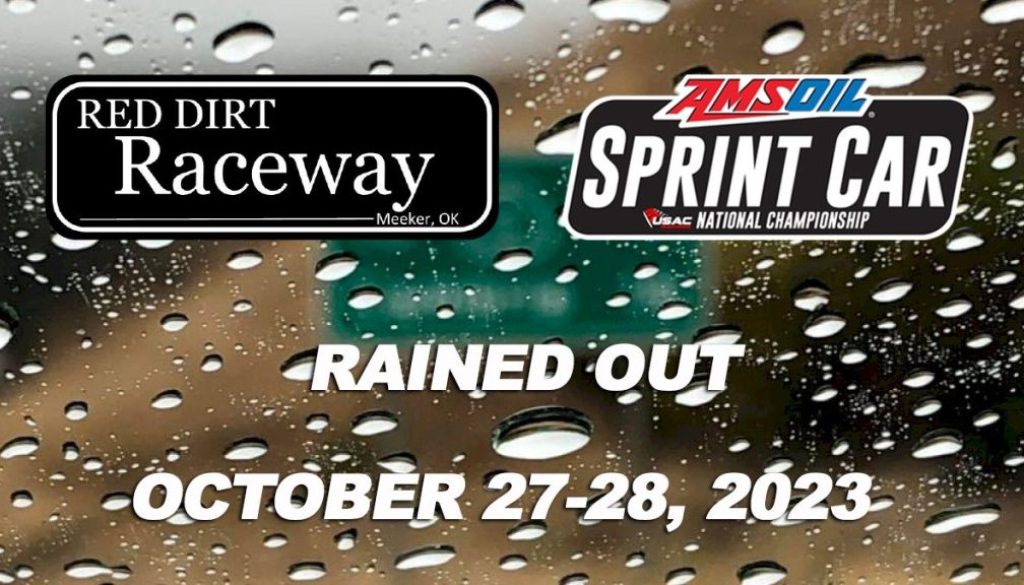 Meeker, Oklahoma (October 25, 2023) . . . Substantial rain today and tonight coupled with forecasted rain this weekend has forced cancellation of the October 27-28 United States Auto Club (USAC) AMSOIL Sprintcar National Championship season finale at Meeker, Oklahoma’s Red Dirt Raceway.