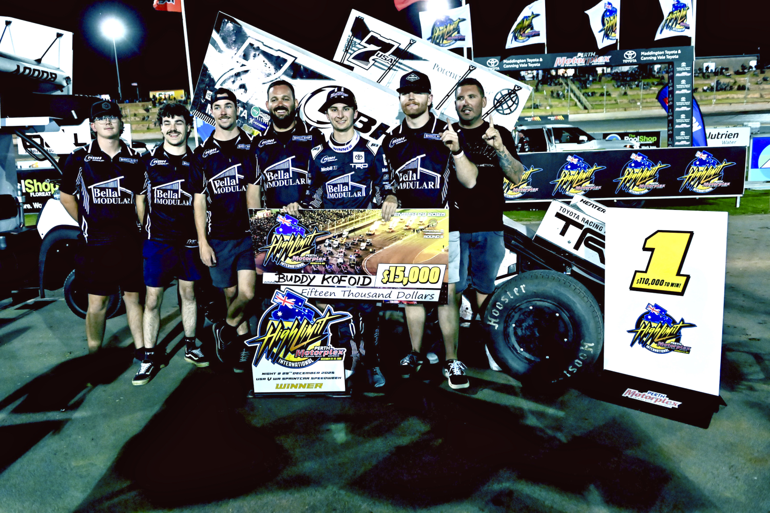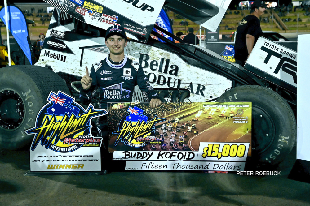 For the second night in three outings, American Buddy Kofoid claimed victory in the Sprintcar feature race at the Perth Motorplex.